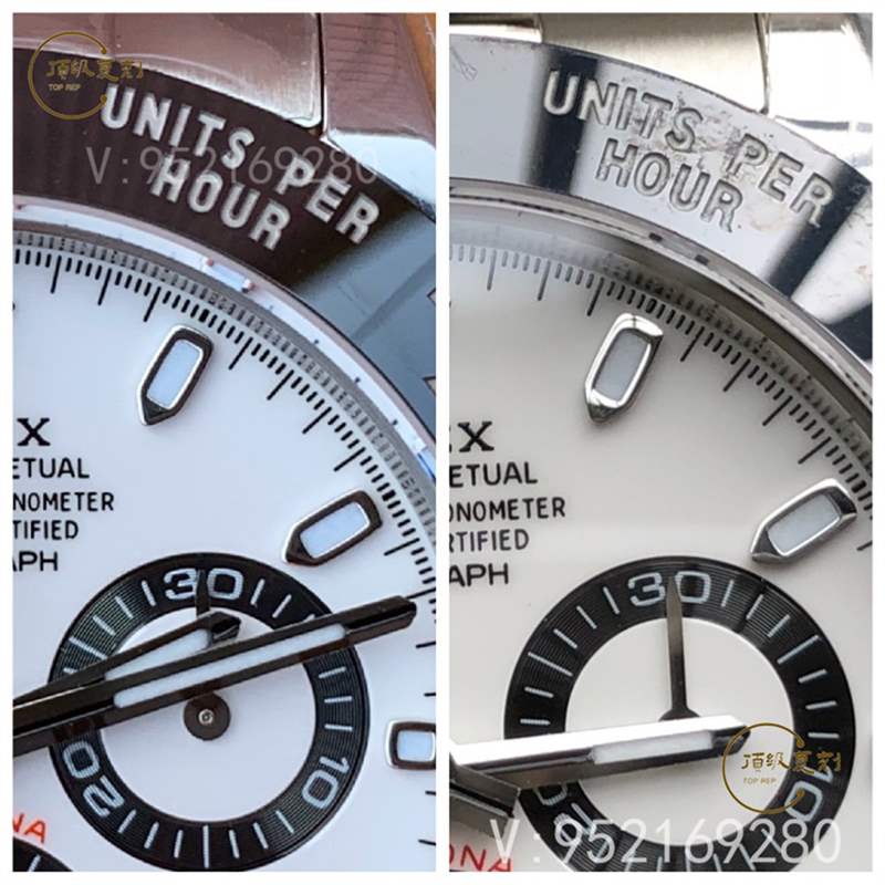 最明顯可以直觀察覺(jué)的就是R這個(gè)字母的形態(tài),我們可以看到。左側(cè)v3版本的就好像一個(gè)兩腿站直的人,而右側(cè)v2版本的迪通拿就是一只腿站著,一只腿伸出來(lái)的,其實(shí)n廠v3版本的勞力士迪通拿整個(gè)外圈都是全部修正過(guò)的,整體的顏色以及字母位置形態(tài)都發(fā)生了變化,整體顏色有了一種銀色的金屬光澤,且厚重了。