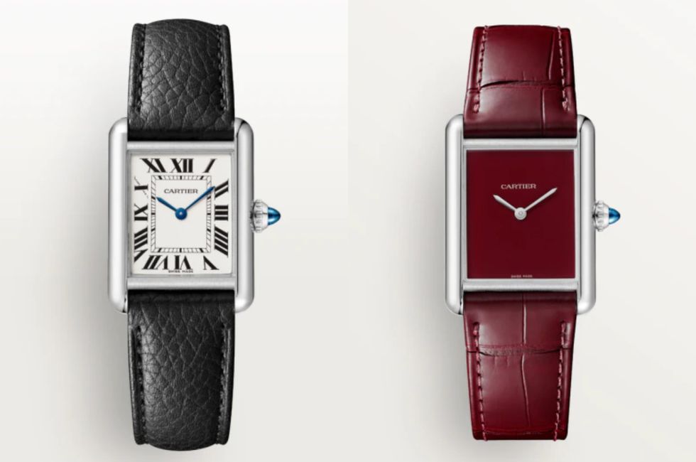 ▲(右)Tank Must腕表,大型款,石英機芯,精鋼表殼,圓珠形表冠鑲嵌1顆凸圓形合成尖晶石,深紅色真漆表盤,深紅色鱷魚皮表帶,表殼尺寸:33.7毫米x 25.5毫米,Cartier。