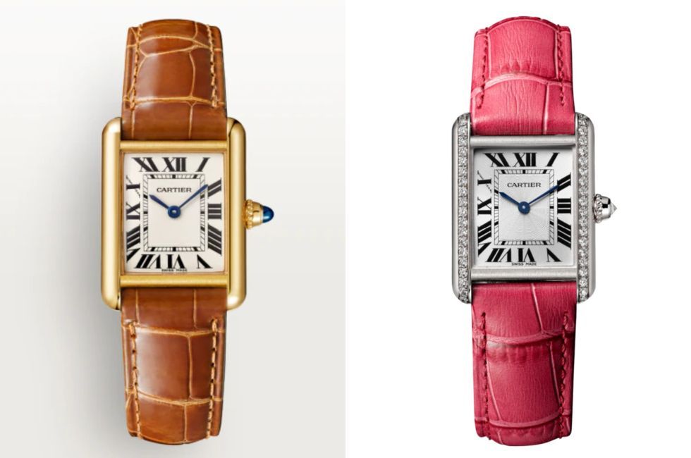 ▲(左)Tank Louis Cartier腕表,小型款,石英機芯,18K黃金表殼,鱷魚皮表帶,表殼尺寸:29.5毫米x22毫米