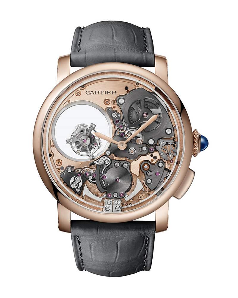 卡地亞高級制表三巨頭中的最后一個產(chǎn)品是前兩者的混合體:Rotonde de Cartier 三問腕表神秘雙陀飛輪。