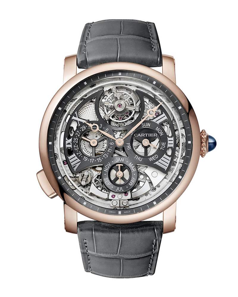 如果神秘指針讓你難以置信,卡地亞的第二個高級制表系列條目更傳統(tǒng)一些。多一點(diǎn)。Rotonde de Cartier Grand Complication Skeleton 在其奢華的 45 毫米表殼中裝有萬年歷、三問報(bào)時(shí)和陀飛輪,所有這些都經(jīng)過鏤空處理。