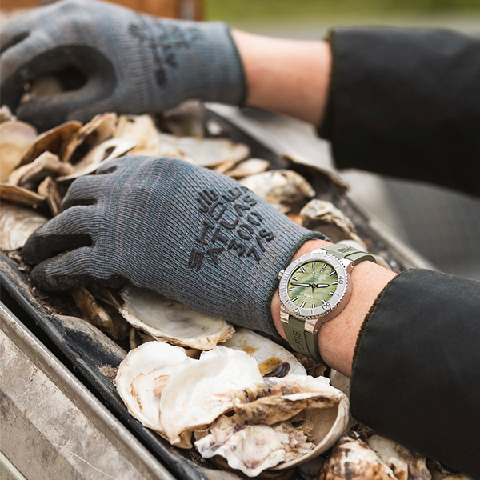 這次的限量款出在Aquis系列,面盤的特殊色澤來自綠色珍珠母貝,靈感是紐約港的水色、珍珠母貝的使用也和牡蠣殼有種系出同源的關聯,加上潛水表的定位用在這次凈化水質的任務也是適得其所,在特殊色面盤的主題之下更賦予了它深層意義。
