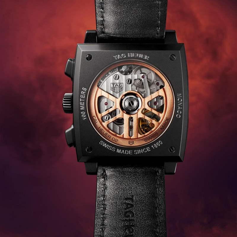 在這款Monaco特別版還有一個設(shè)計亮點,中間圓形面盤之外的四個角落改成黑色粒紋飾面,這項細(xì)節(jié)讓面盤更有層次;指針與刻度采用金色、紅色與白色的鮮明對比,另外后底蓋上可以看Heuer 02機芯,并采用鍍玫瑰金自動盤,先前Monaco不銹鋼版本則是使用黑色自動盤。