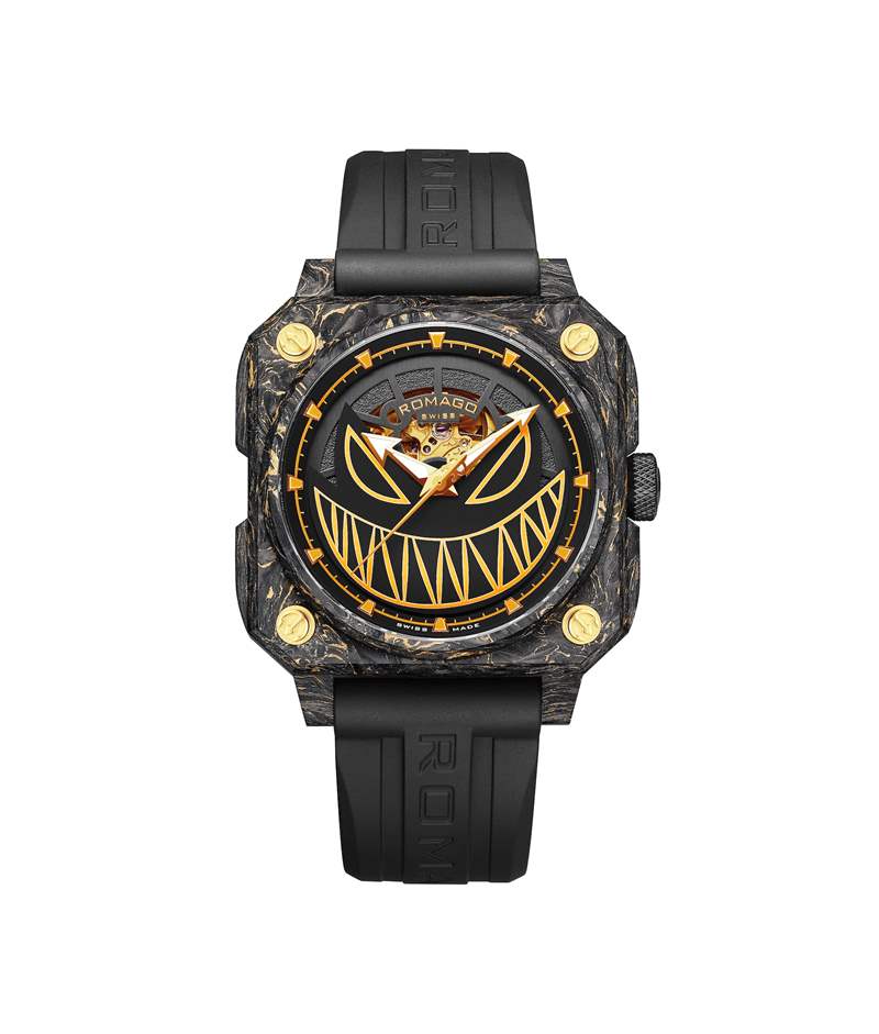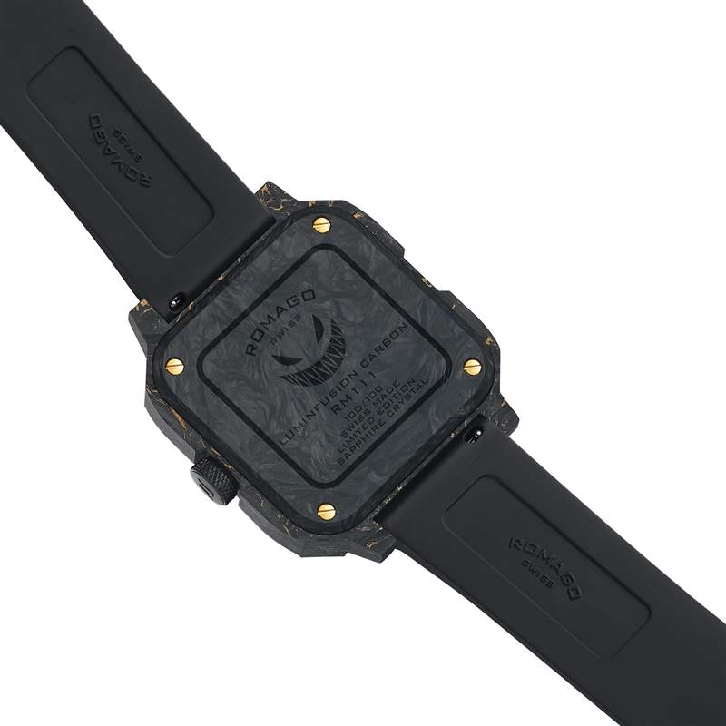 這枚46.5mm碳纖維方形腕表搭載瑞士制的自動上鏈鏤空機(jī)芯,具有50米防水深度,腕表配備前置式超大型擺陀,設(shè)計大膽而創(chuàng)新。除了表殼內(nèi)混合18K黃金及夜光物料,指針、時標(biāo)、擺陀與品牌標(biāo)志亦涂上了夜光涂層,在黑暗中清晰可見,密封底蓋鐫刻了限量編號,表圈裝飾螺絲并飾以三叉戟圖案雕刻,整體風(fēng)格型格迷人,別具個性。是次新作僅限量100枚,定價為43,800港元。