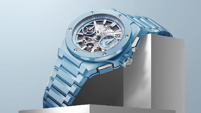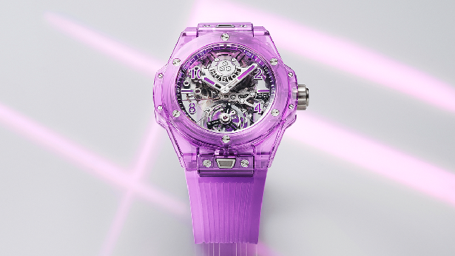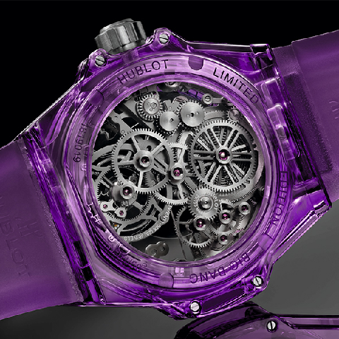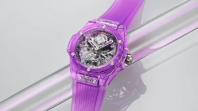 從2016年HUBLOT推出第一款藍寶石水晶表款到現在,幾乎是一年一個顏色在推陳出新,到目前已經有紅橙黃綠藍五種顏色,今年又新增了紫色。關于技術面HUBLOT向來都滿神秘的不對細節加以詳述,針對藍寶石水晶表殼,品牌資料里說明是以氧化鋁(Al?O?)和鉻元素調制成的特殊比例,而除了調配出想要的顏色之外,熔點高、硬度強的材質特性,也增加了藍寶石水晶的加工難度。