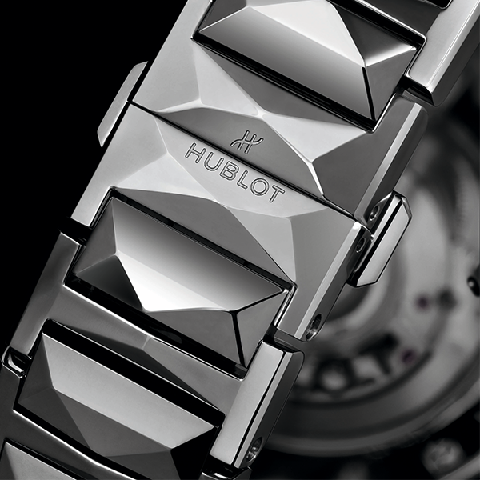 HUBLOT將Orlinski表款最著名的立體切面擴大運用,推出Orlinski鏈帶款腕表。不只鏈節融入象征HUBLOT的H形狀,針對鈦金屬做出多切面的加工技法,也是HUBLOT的技術展現。