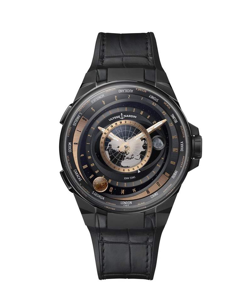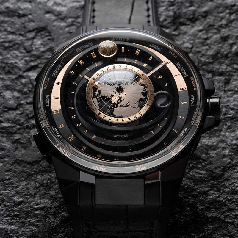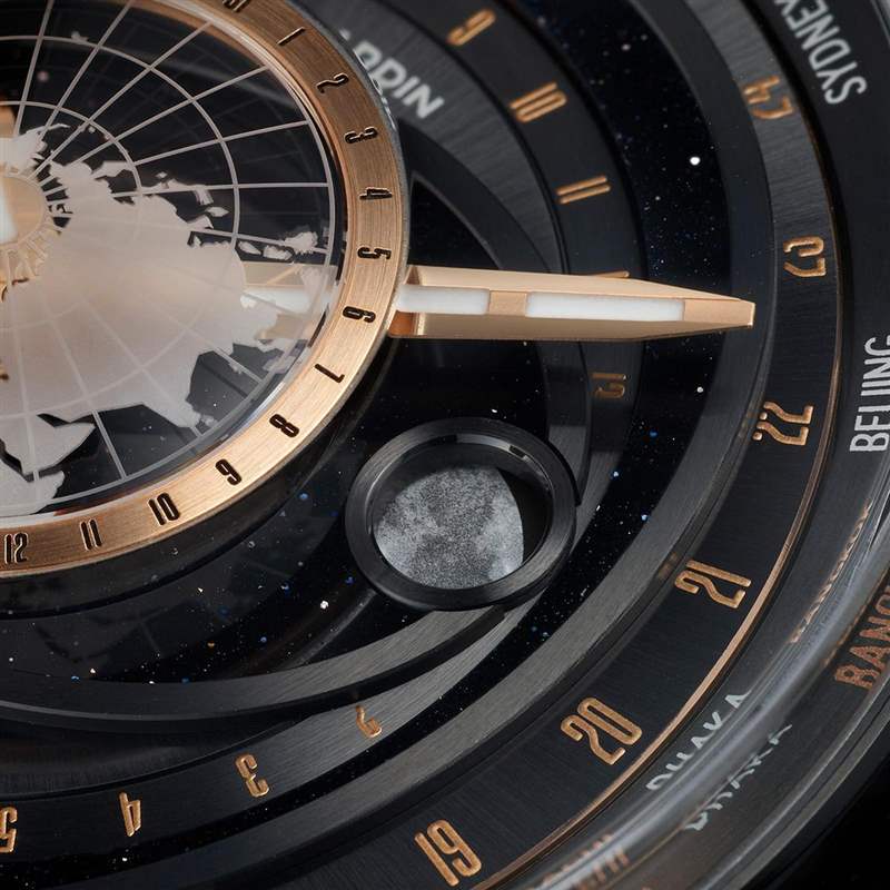 中央固定位置的地球圓盤呈現北半球的地圖,采用相同的拱形藍寶石水晶設計;從中心點向外延伸,中央的橢圓形部分為月亮的軌跡,每29天12小時41分9.3秒會沿表盤繞行一周,是月相變化的完整周期,再往外則是太陽,以及世界時區城市環。至于左側的兩個表冠,可以直接以小時為單位,快調主要時區的時針,快速切換時間。