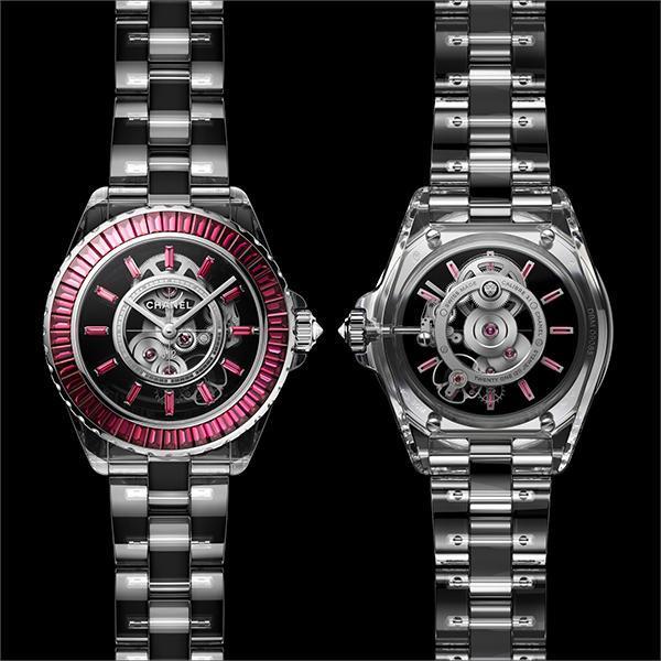 Red Edition的三只新表包括J12 X-Ray、Boy·Friend X-Ray還有Boy·Friend鏤空。X-Ray是CHANEL在兩年前J12 20周年的時候推出的藍(lán)寶石水晶版本,從表殼到鏈帶都是藍(lán)寶石水晶,呈現(xiàn)出極致的通透感,之后Boy·Friend版本的X-Ray也跟著發(fā)行,整個表殼都以藍(lán)寶石水晶打造。到了這次的Red Edition,主要變革是加入紅色元素做為改款,J12 X-Ray的時標(biāo)和表圈都鑲上了紅寶石,透亮又飽和的成色搭配藍(lán)寶石水晶的通透,看起來更有媚惑的張力,鏤空的設(shè)計從表背也能透視紅寶石時標(biāo)的色調(diào),搭載的仍是兩年前隨著J12 X-Ray登場的Caliber 3.1機(jī)芯。