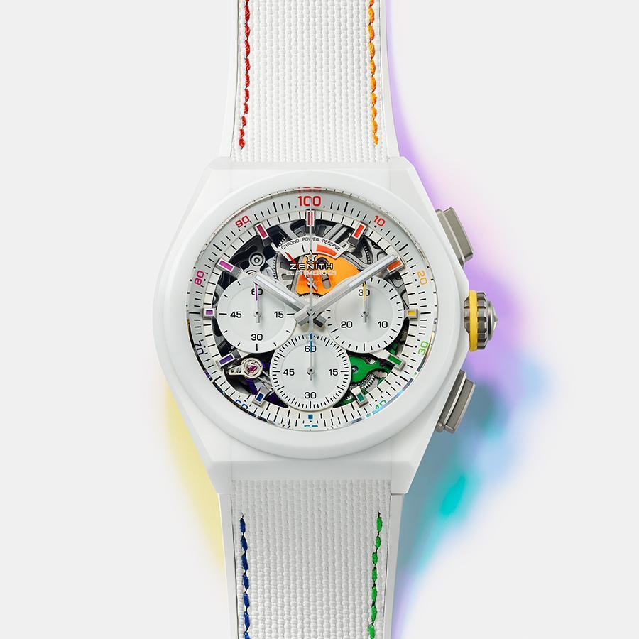 這兩年ZENITH在顏色方面有不少新的嘗試,像是利用機芯電鍍結合有色藍寶石水晶鑲嵌的DEFY 21 Spectrum、DEFY 21 Ultrablue以及Ultraviolet也是將顏色鍍到夾板上的嘗試。今年ZENITH又多了一種顏色表現的新手法,Defy 21 Chroma利用彩虹般的顏色呈現,在時標和計時刻度上攤開了一圈色譜,時標顏色下方的夾板也以同色調鍍色呼應,搭配白色陶瓷表殼圖顯得更繽紛,白色表帶也車了四條不同顏色的縫線,搭上El Primero 9004高振頻機芯,以彩虹色和高振頻為這只專賣店限量款創造亮點。