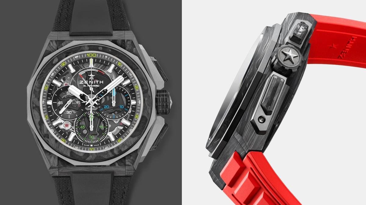 兩年前ZENITH在DEFY 21 Carl Cox限量版就出過碳纖維表殼,今年則是將碳纖維做了更粗獷的運用,利用碳纖維的材質特性和賽車領域結合,推出表徑來到45mm的DEFY Extreme Carbon。除了表殼之外,按把和表冠也都是碳纖維材質,鏤空面盤上的時標刻度顏色,也都是源自Extreme E電動車越野錦標賽的相應色調,身為賽事官方指定計時的ZENITH,往后預計也會有更多賽事相關特別款的推出。