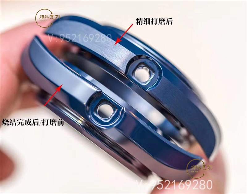 模具注入氧化鋯1000bar壓力成型,一次成型,操作難度大,因為燒結過后體積會發生變化,所以模具的制作難度是比較大的。把搭配好的原材料攪拌成陶瓷漿料到機器里面注塑成型,然后需要用上百噸的液壓機壓縮成型。這道工序是非常的重要,如果原材料粉末有雜質、陶瓷漿料配方比例不對、壓縮的力度和時間長度,都可能導致粗胚在燒結過程中出現很多的沙孔、裂痕,直接為廢品。非常多的不確定因素,導致了陶瓷的不良品率是非常高的。20000度的爐子,要經過3個小時的燒制,溫度與時間的把控要到位,不然成品率會極低。這時的陶瓷硬度應該是常見金屬的好幾倍了。敲擊殼身的聲音,會有中悅耳的清脆聲。用螺絲刀劃殼身,有白色刮痕,但是用手指一擦,白色刮痕就沒有了。燒結前后,原來比較大的粗胚燒結成結實的陶瓷,在等離子高溫下燒結,不斷的收縮硬化,出來半成品體積至少比燒結前收縮了3分之一。篩選出殼身有沙孔,裂痕的不良品直接報廢,良品進入下道工序。表冠/表扣/表盤/底蓋四大配件全部采用ZrO2,二氧化鋯陶瓷材質,整體材質相對于一般的復刻來說更上一層樓。