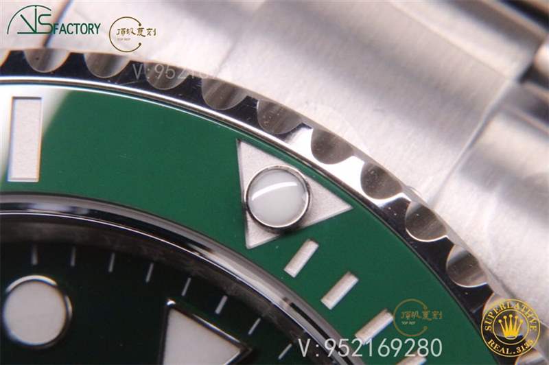 首先是顏色,原裝的綠色屬于保密的工藝,因為陶瓷綠色的燒制需要特殊的配方以及固定的問題,不然呈現出來的顏色是有不同的。這一點上,復刻經過多年的競爭改進,已經無限接近正品,包括綠金色的盤面,同樣是放射紋路。VS把圈口刻度做到全新正品未使用的狀態。真的把刻度鉑金涂層從市面的銀灰色提升到銀亮色(全新正品未使用的顏色),刻度底紋細膩,而且涂層覆蓋更均勻到位,刻度涂層光線反射好,刻度看起來銀亮,就會感覺粗。用一段時間后,刻度涂層被汗液、灰塵附著后,沒那么銀亮就不粗了,好好體驗一次正品新表的質感吧。為了大家更好的理解,給大家打個不太恰當的比方。例如:同一款車,白色車看起來會比黑色車顯得大一點,但尺寸說完全一樣的。再例如:一間墻面刷白,沒擺放家具的房間,會比刷灰色墻,擺放家具的房間,顯得寬敞。尺寸是一樣,我們視覺感會有差異。