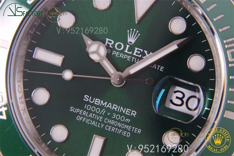 表盤,VS廠表盤做工也是非常用心,表盤上的刻度角進行圓角拋光處理同步原始工藝,刻度夜光填充顏色和指針相同,刻度和指針填充顏色是黃色或灰色指針拋光工藝很高,指針邊緣無毛刺!指針夜光填充到位沒有溢出來,腕表上的指針非常的扎實,指針中軸也是做得非常完美的,實心中軸的一起還帶有錐形的姿態很不錯。當然不同年份的水鬼,中軸這兒多多少少都會有些差異的,所以不能說有的廠家沒有這樣的形狀就不是對版,只不過看廠家買到哪個年份的水鬼進行開模復刻。表盤上帶有泡泡鏡的日歷窗口,窗口開孔工整無毛邊,日歷數字立體易讀,日歷底色對版,整個日歷數字滾動居中無差錯!綠色盤面帶有綠金的放射紋,而且它的綠金是會略微激烈一些 ,6、9、12點刻度邊角有做圓角打磨處理同步原裝工藝,刻度的夜光填充物色彩和指針是相同的,這點來說是完全對版原裝。