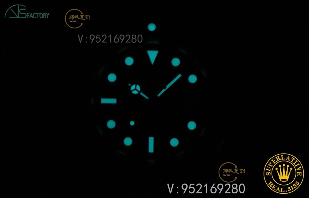 首先看陶瓷圈口,陶瓷圈口顏色是重點。翠綠色的陶瓷圈口,多次修正顏色,顏色已經十分接近正品。為了與正品更加接近,圓口上的刻度采用鉑金真空電鍍涂料,亮銀色也與原裝配套,做得很好。連夜明珠的色澤也做的像玉石般的質感、非常的圓滑,夜明珠凸起高度也做到了跟原裝一起!VS更是在圈口添加了防指紋涂層,這樣就不容易留下指紋了!之前我們對比中曾經介紹VS的涂層覆蓋密度最大,緊實,其他的工廠的都有一些稀松。目前很多的銷售手表的也是看客戶的需求,其實不少賣家對于手表并不是很了解,只是說方便拿到什么就給客戶推薦什么,更何況市面上太多冒充VS的產品,以至于有的表迷拿到冒充的會認為VS的就是這樣。