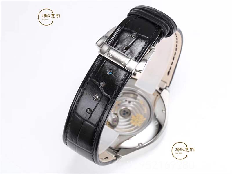 表帶MKS采用的是進口的小牛皮,并整齊打印伯爵的商標以及型號。這條表帶比之幾千元的進口鱷魚皮帶質感差了一些,不過大體外觀相差不大,細節做工肯定是不能與五千的表帶想比。