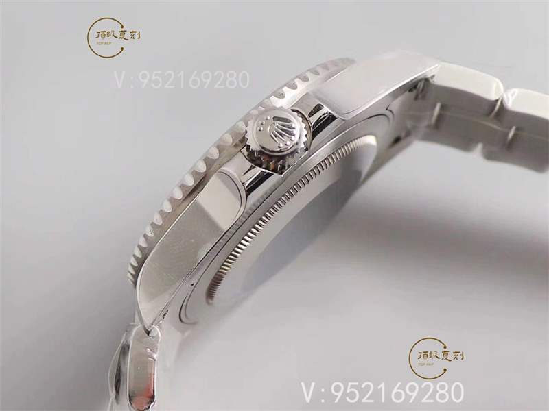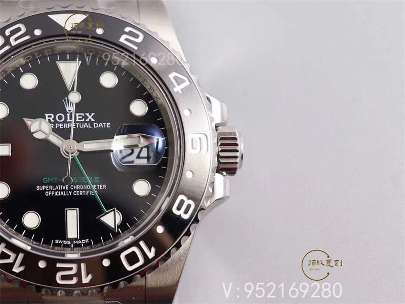 這款表的表徑為40mm,由于表圈占據了較大的空間,因此表盤并不顯得非常大。很多表迷喜歡那這款與黑水鬼對比,畢竟拋開綠色gmt以及六點位置字母之外,與很水鬼相差并不大。一體成形的陶瓷圈口與正品一致做法,不用擔心圈口脫落,且字體不易掉色。