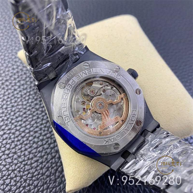 APS廠愛彼皇家橡樹黑陶瓷萬年歷復刻表是背透設計,防眩光處理的藍寶石玻璃后蓋,清晰呈現機芯,佩戴者可以充分領略這款APS廠自產機芯的機械之美。愛彼全新Cal.5134自動上鏈機械機芯以 Cal.2120 機芯為基礎。2120機芯,無秒針,直徑39毫米,厚度7毫米。這款機芯仍然是最好的自動超薄機芯之一。 Cal.5134經過改進和擴展以適應41毫米的表殼,就像一個飾有圓形日內瓦紋的吊桶,所有橋板都經過倒角并飾有日內瓦紋,22K金擺陀上刻有“Audemars Piguet”字樣外緣飾以方格圖案,呼應皇家橡樹系列標志性的盤面設計。(APS廠愛彼15407皇家橡樹鏤空機械復刻表做工如何