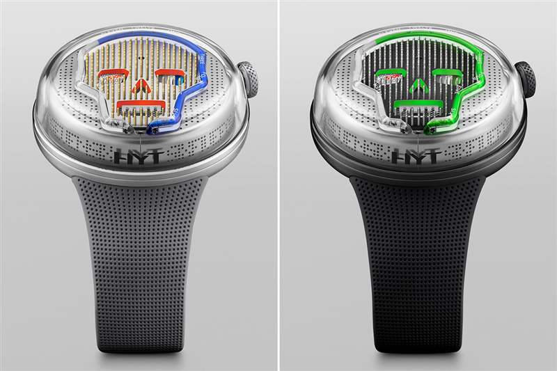 除了帶有工業外觀的骷髏本身周圍的穿孔金屬表盤之外,最后的表盤觸感是包含長形書寫并懸停在綠色液體上方的時標。
