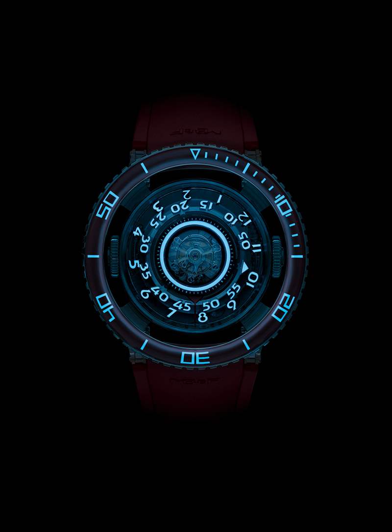 這是一次徹底的整容,將黑暗的 Aquapod 徹底轉(zhuǎn)變?yōu)楦髁恋臇|西,但這并不是新手表的全部。以前的 HM7 依靠旋轉(zhuǎn)環(huán)和轉(zhuǎn)移數(shù)字來(lái)告訴時(shí)間,這個(gè)版本依靠浮動(dòng)鈦數(shù)字。
