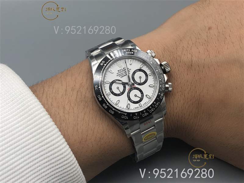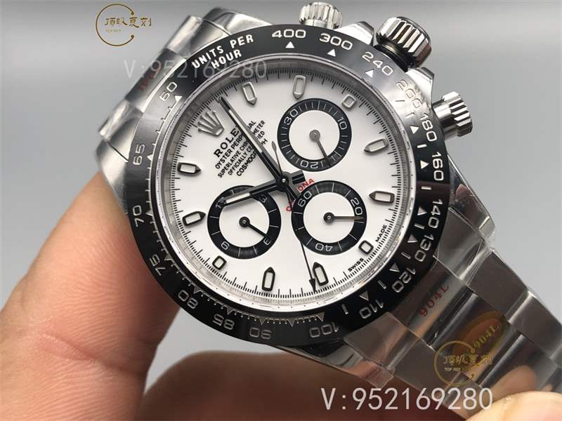 主要升級之處:圈口升級,V4版刻度相對于V3版更亮一些,更接近正品的色澤,而且這次采用物理氣相沉積技術(shù),將色油高溫涂覆在字體上,使圈口的競速刻度完全符合原裝的粗細,而且長時間佩戴根本不會掉色。字面,顏色為象牙白色,比之前更亮更好看;指針方面也是升級了實心中軸。狗頭、天平、750等貴金屬標志肉眼看上去和原裝幾乎沒有分別。表扣皇冠和扣身一體成型,而非點焊。N廠勞力士熊貓迪的配色是黑白相間,40毫米的表徑,不同手腕都可佩戴,整表的圈口、鏡面、內(nèi)罩、把頭、字面、指針和表扣均可與原裝通用。表殼以904精鋼材質(zhì)打造而成,相對于316鋼,在質(zhì)感上就有區(qū)別,并且904鋼材更加堅硬,耐刮花,耐磨性更好,抗腐蝕性也高,黑色的陶瓷材質(zhì)外圈,圈口上的刻度采用物理氣相沉積技術(shù),將色油高溫涂覆在字體上,使圈口的競速刻度符合原裝的粗細,而且做到不掉色、不褪色。圈口上面雕刻“units per hour”英文和數(shù)字,這里要和大家科普的是迪通拿的這一圈數(shù)字是測速用的,配合計時功能使用,算出每小時的速度。經(jīng)典蠔式密底設(shè)計,因為殼體底部要與皮膚接觸,所以采用環(huán)狀細紋拉絲處理,底蓋低平,倒梯狀,僅高2.5mm齒圈邊緣均做倒角處理,拋光打磨的精致毫無扯拉感。 此次V4勞力士熊貓迪用4130真正的一體機芯,沒有一片多余的甲板或者假齒輪,這也保證了表殼沒有超厚。機芯甲板的細紋和洗花精致細膩,字體清晰深刻,計時歸零干脆有力,功能對版。同樣配置原裝的KIF避震器,藍色游絲。