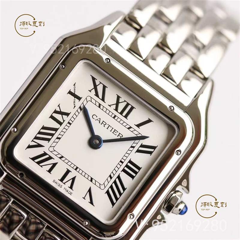 GF廠采用1:1正品開模,屬于Panthère de Cartier獵豹系列的中號表款,尺寸為長37毫米,寬27毫米。拆開表帶,頭粒,與正品放一起,孰真孰假,很難分辨,外觀還原程度極高 。