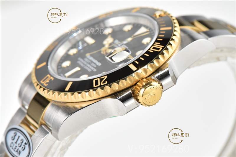 這款clean廠勞力士間金水鬼可以算得上是水鬼的升級版,整體還是延續了潛航者系列的經典造型設計,獨特904鋼材質表殼,立體時標以及指針采用的都是黃金材質,金色的表圈、金色的表冠、精鋼表殼搭配間金表鏈,不管是從整體黑金搭配還是材質選用上,這次都下了大工夫,只有這樣,才賦予了這款腕表尊貴大氣的美感。表殼采用904L精鋼鍍金材質,黑色陶瓷表圈上的金色刻度鐫刻精致完美,間距一致,倒三角里的夜光珠居中對齊,飽滿圓滑,鏡面采用藍寶石水晶鏡面,通透性十足,耐摔防劃。