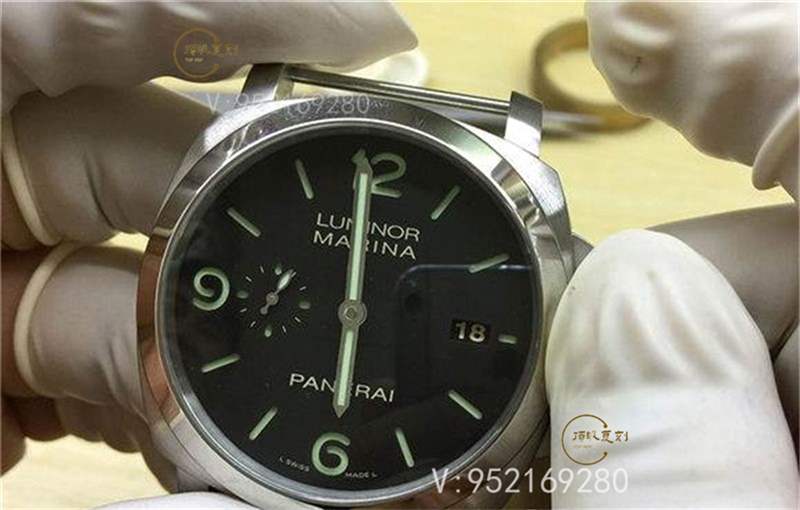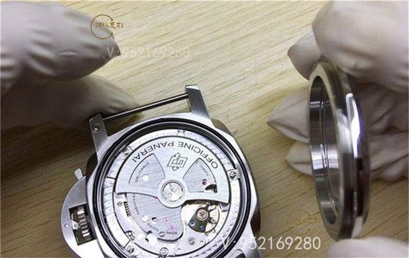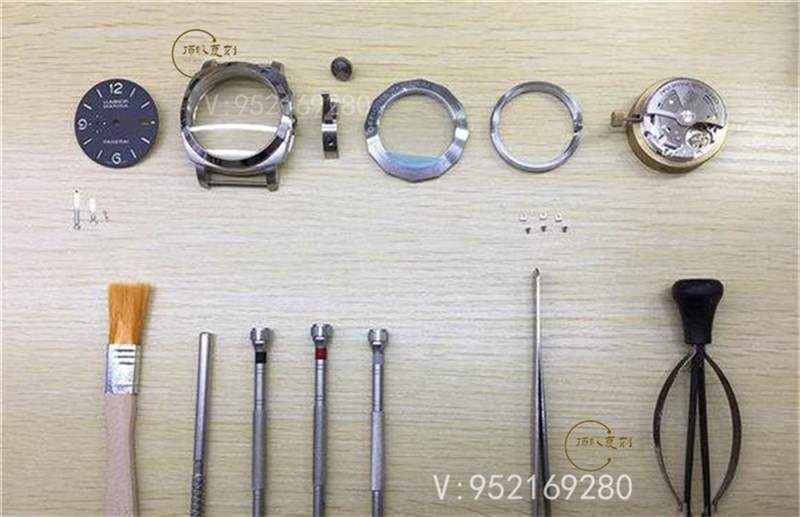首先我們看到的是手表的各個構(gòu)件,依次擺放的是:SBF廠的Pam312的表面,指針,表殼,把頭,護橋,底蓋,固機罩,固機片和螺絲,P9000機芯。雖然看似簡單幾個配件,但是要組合成一只相對完美的成品表,工作量是非常大的。每款配件都需要放大鏡QC檢查,要求越高,次品率越高。指針非常容易花,起霧;表盤不能有白點,夜光不能有黑點;表殼不能有劃傷痕跡,要防水;護橋要有力度,機芯走時要穩(wěn)定等,所以復(fù)刻為何價格高,并非其利潤高,相對于原裝,復(fù)刻充其量白菜價格。