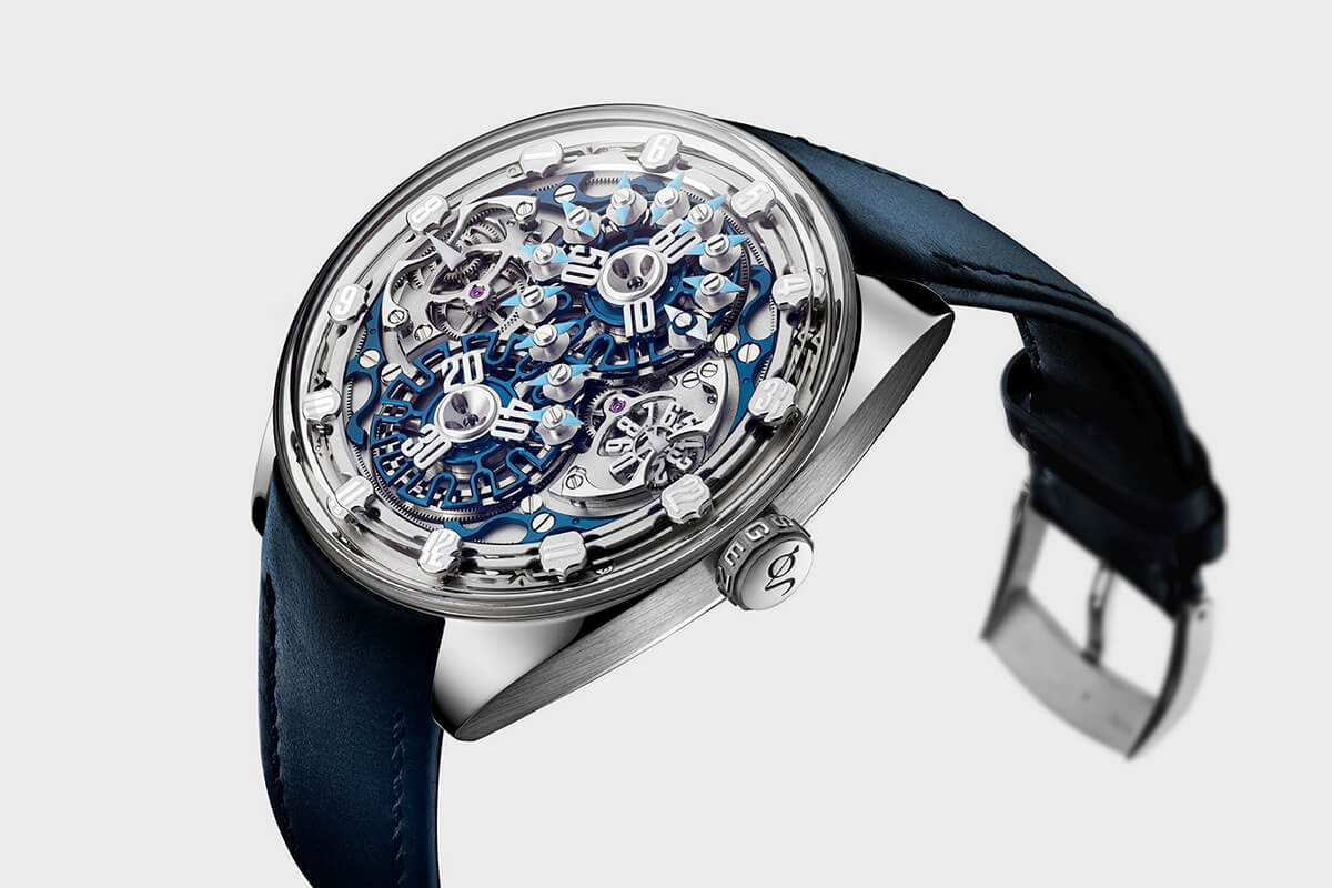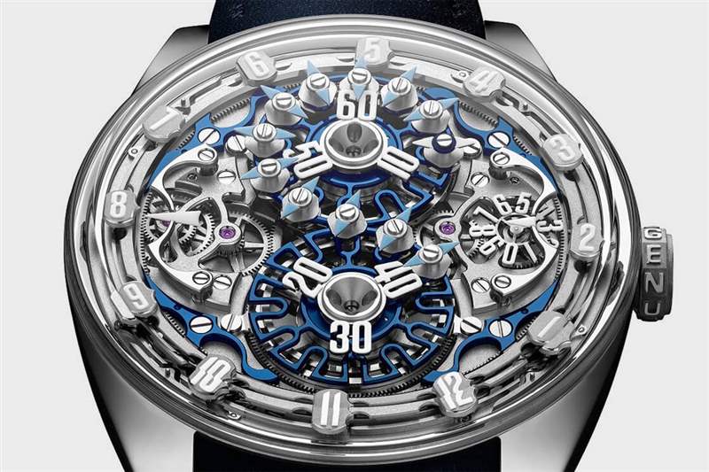 這種復雜的性質與科學實驗失控的設計相結合,所有鋒利的藍鋼和活動部件都沒有表盤擋住。43 毫米白金表殼的尺寸恰到好處——一些制表師甚至會想要更大一點——并且包含明顯的內部手動上鏈 Calibre GNS1.2。