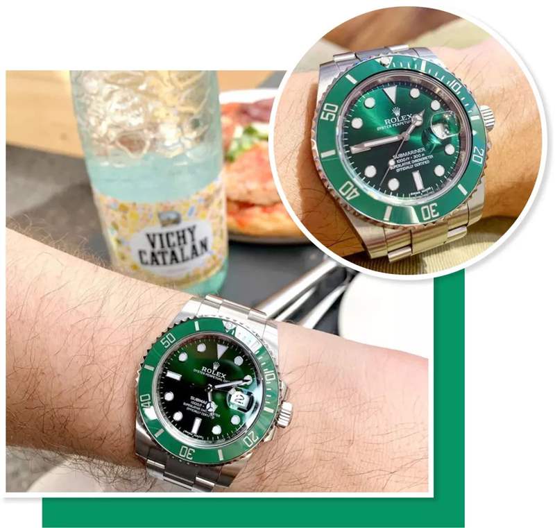 更重要的是,綠色的表盤辨識度實在太高了,遠遠一看就能識別。這也是綠水鬼比其他水鬼更火的原因——社交屬性太強了,我見過創業公司的老板戴它,也見過燒烤店的老板戴它,說它是爆款一點也不為過(當然假貨也不少)。