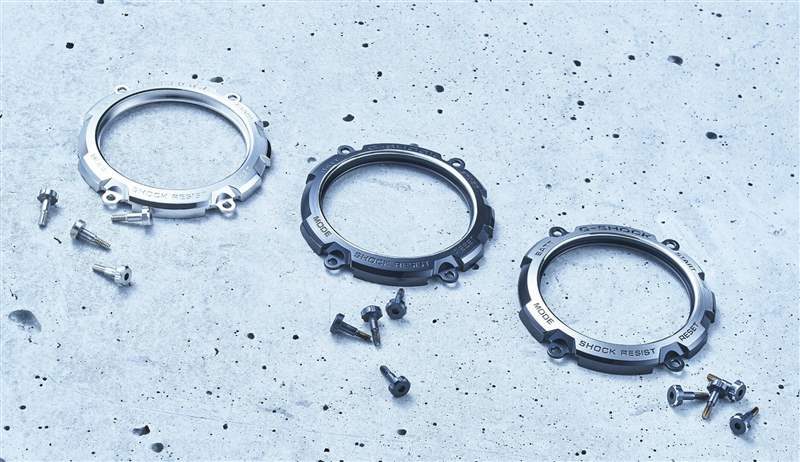 頂部表圈是手表的關鍵部件,由不銹鋼制成,整個表面涂有黑色IP,然后僅對頂部表面進行拋光。表圈的頂面覆蓋著發際線不銹鋼,但G-SHOCK標志和其他字母以及表圈斜面覆蓋著黑色IP,與表圈的銀色形成鮮明對比。這種技術也用于突出設計的四顆螺絲,當與帶有多個延伸爪的巧妙形狀的表背相結合時,它創造了一個真正的三維工業外觀。這是為 GMW-B5000MB 開發的加工技術的早期應用的一個例子。