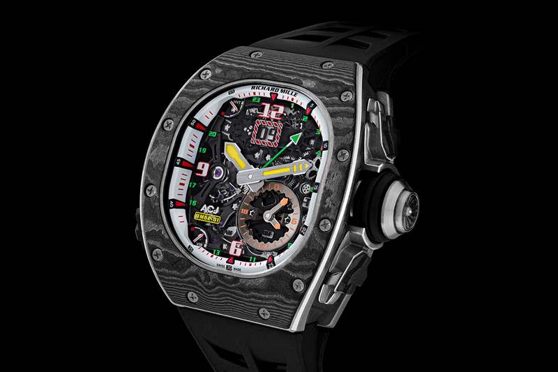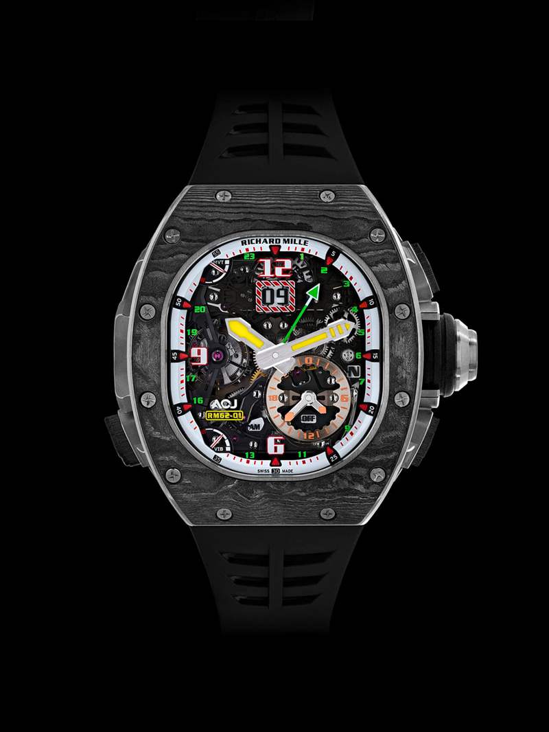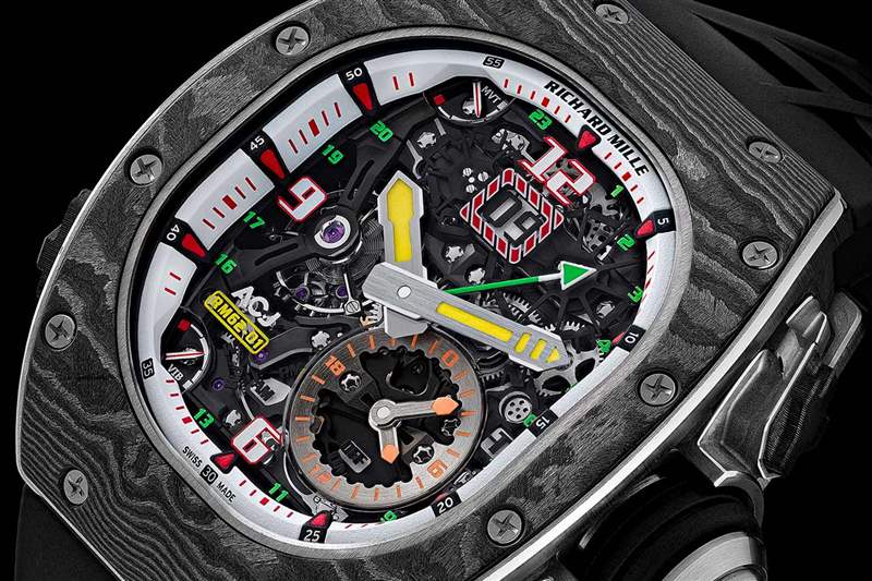 這是與空中客車定制機翼的第二次合作,它是一只野獸。鈦合金和碳纖維表殼與您預期的一樣大,為 42 毫米 x 49.94 毫米,但由于表殼材料和部分鈦金屬機芯(手動上鏈機芯 RM 62-01),它出奇的輕巧。然而,那里仍然有大量的鐘表。