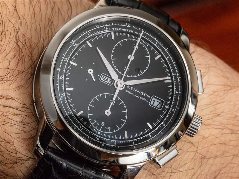 精鋼表殼本身拋光良好(Kennsen 說大部分是手工拋光的),防水深度達 50 米。它寬 42 毫米,厚 13.4 毫米;它的凸耳到凸耳的距離為 49 毫米。年歷計時碼表不僅僅是可穿戴的,但考慮到這件作品所追求的美學主題,它在手腕上確實感覺很大。其中一些可以通過重新設計表盤來解決。鑒于機芯的正常厚度,Kennsen 似乎無法將表殼做得更薄。因此,對于這個問題,他們可以做的最簡單的解決方法是為表盤創建一個新的、更現代的設計,以補充更厚表殼的外觀。我相信我們在這個版本的年歷計時碼表中所擁有的有點不匹配,因為表盤想要什么以及表殼是什么。