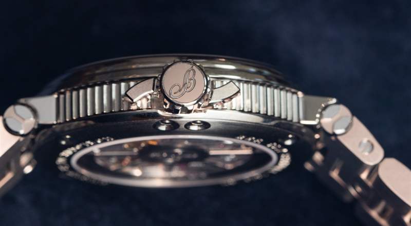 手鏈本身采用簡(jiǎn)單的三連桿設(shè)計(jì),但充滿了受歡迎的細(xì)節(jié)。查看手鐲的側(cè)面,注意大多數(shù)鏈節(jié)沒(méi)有螺絲孔。相反,寶璣開(kāi)發(fā)了一種系統(tǒng),該系統(tǒng)使用位于表鏈內(nèi)側(cè)的螺釘為鏈節(jié)提供固定機(jī)制。另請(qǐng)注意折疊展開(kāi)式表扣。它可能看起來(lái)很標(biāo)準(zhǔn),但寶璣開(kāi)發(fā)了一種全新的展開(kāi)器,帶有優(yōu)雅的按鈕,看起來(lái)和操作起來(lái)都非常好。在我看來(lái),手鐲中缺少的只是一個(gè)微調(diào)系統(tǒng)(盡管我不確定是否有必要)。