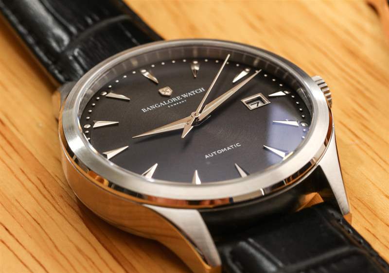 40 毫米寬的中等尺寸非常適合這種設計。表殼防水深度為 100m,厚度約為 12mm,表耳到表耳的距離為 47mm。班加羅爾手表公司確保表殼非常拋光,對比拋光和拉絲表面很容易使它看起來類似于更昂貴的鐘表。表盤上方是 AR 涂層圓頂藍寶石水晶,有助于增加“高端”外觀。手表背面的另一個藍寶石水晶可以看到自動機芯。附在表殼上的是一條 20 毫米寬的表帶。班加羅爾手表公司包括一個快速釋放桿,如果庫存的鱷魚紋皮革表帶與您當前的服裝不匹配,您可以將表帶換成您喜歡的任何其他東西。班加羅爾手表公司還提醒大家,它在表帶底部使用了磨砂襯里,以使其更加防汗防水。與手鐲不同,皮表帶確實需要不時因磨損而更換。
