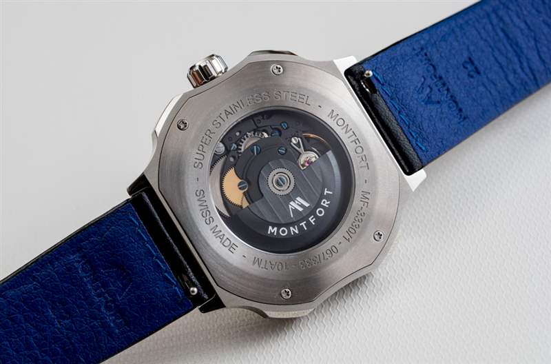顯然,Montfort 了解紋理、飾面和顏色的重要性。如果我只能給設(shè)計(jì)師一句贊美的話,就是這樣。在這一點(diǎn)上,許多手表收藏家無(wú)疑會(huì)欣賞黑色機(jī)芯。該機(jī)芯是瑞士 Sellita SW200 自動(dòng)機(jī)芯(4Hz,動(dòng)力儲(chǔ)存 42 小時(shí)),但黑色電鍍涂層搭配藍(lán)色螺絲。這采用了機(jī)械機(jī)芯的傳統(tǒng)設(shè)計(jì),似乎同時(shí)使其更酷和現(xiàn)代。我真的很欣賞這種微妙但明顯的額外觸感。