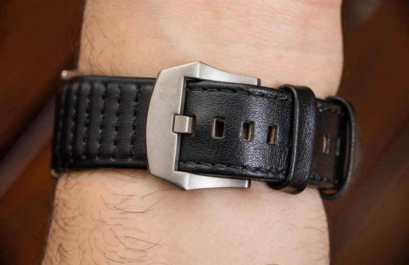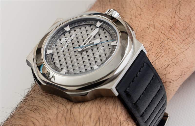 Montfort 自豪地用“超級(jí)不銹鋼”制作 Strata 的 44 毫米寬表殼。這是他們對(duì)一種特殊硬化鋼的名稱(chēng),這種鋼的表面密度比其他標(biāo)準(zhǔn)鋼表更高。實(shí)際結(jié)果是表殼比類(lèi)似的鋼表更耐刮擦。表殼的磨損比它可能暗示的 44 毫米寬尺寸要小一些,這是因?yàn)樗暮穸葎倓偝^(guò) 10 毫米,以及相對(duì)較短的(寬度)47 毫米的凸耳到凸耳的距離。此外,由于表耳的樣式,折疊的地方?jīng)]有長(zhǎng)長(zhǎng)的“角”伸出。