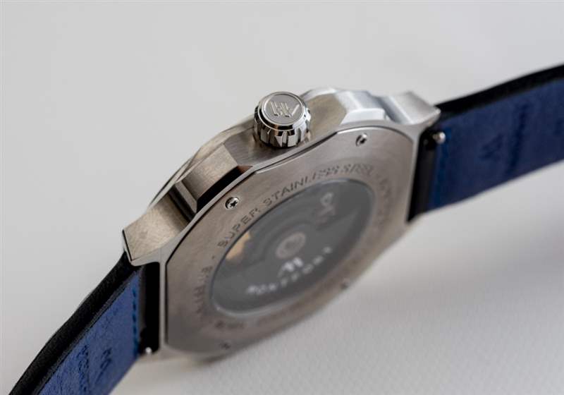 說(shuō)到表帶,Montfort 使用了一條漂亮的意大利制造的絎縫黑色皮革表帶,內(nèi)側(cè)帶有藍(lán)色(在這款手表上)Lorica 襯里。回到這個(gè)案例,我發(fā)現(xiàn)它做工精良,而且看起來(lái)很有趣。雖然案例風(fēng)格當(dāng)然不適合所有人,但我相信沒(méi)有人可以指責(zé)它很無(wú)聊。雖然我佩戴這款手表的時(shí)間不長(zhǎng),但我相信 Strata 表殼設(shè)計(jì)肯定會(huì)隨著時(shí)間的推移而成長(zhǎng)。表殼進(jìn)一步防水 100 米,并在表盤(pán)上具有 AR 涂層藍(lán)寶石水晶。另一個(gè)藍(lán)寶石水晶放置在手表后部顯示的機(jī)芯上方。