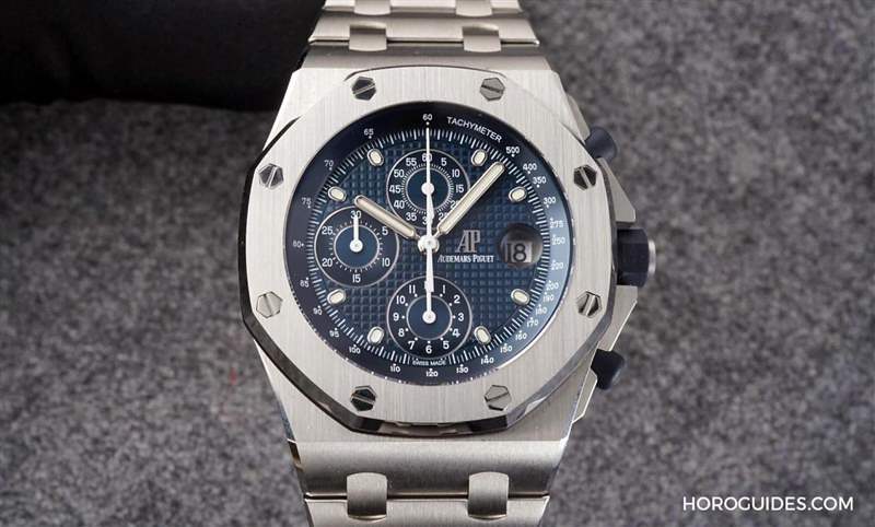 表款為不銹鋼材質(zhì)、42mm表徑、定價為CHF 25,000(約為臺幣76萬1000、港幣19萬9000),經(jīng)典的八角形表圈以拉絲打磨處理、邊緣為亮面拋光,鎖上亮面的六角螺絲,表冠與計時按鈕為深藍(lán)色的橡膠材質(zhì)。