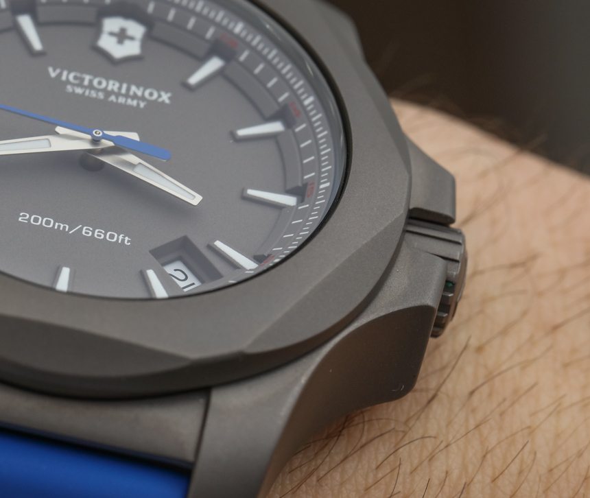 與標(biāo)準(zhǔn) INOX 的拉絲和拋光鋼表殼不同,Victorinox Swiss Army 采用全噴砂處理鈦金屬表殼。我有一種感覺(jué),這是 2 級(jí)和 5 級(jí)鈦金屬,這實(shí)際上很有趣,因?yàn)?INOX 式表殼的清晰角度和精確曲線做得非常好。與鋼相比,鈦的灰色外觀也在設(shè)計(jì)中得到了強(qiáng)調(diào)。此外,表殼的啞光處理流向表盤,為這款生活方式運(yùn)動(dòng)手表帶來(lái)更加清醒、工具風(fēng)格的外觀。