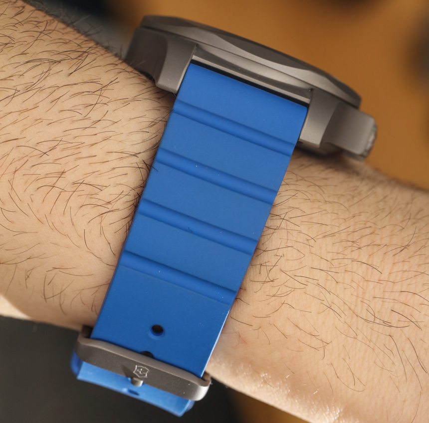 再一次,這款啞光 Victorinox Swiss Army INOX 鈦金屬防水深度達(dá) 200 米,表盤上方是 AR 涂層藍(lán)寶石水晶。Victorinox Swiss Army 提供三種不同顏色表帶的 INOX Titanium。這些型號(hào)還具有與表帶顏色相匹配的滴答作響的秒針——從理論上講,這使得更換表帶變得很困難。話雖如此,這是一條 21 毫米寬的小尺寸表帶,并采用優(yōu)質(zhì)橡膠制成,非常適合舒適的佩戴體驗(yàn)。三種顏色選擇是(編號(hào) 241759)藍(lán)色表帶配藍(lán)色秒針、(241758)橙色表帶配橙色秒針和(241757)灰色表帶配紅色秒針。老實(shí)說(shuō),它們都很好,盡管我認(rèn)為灰色和藍(lán)色 INOX 鈦模型會(huì)做得最好。