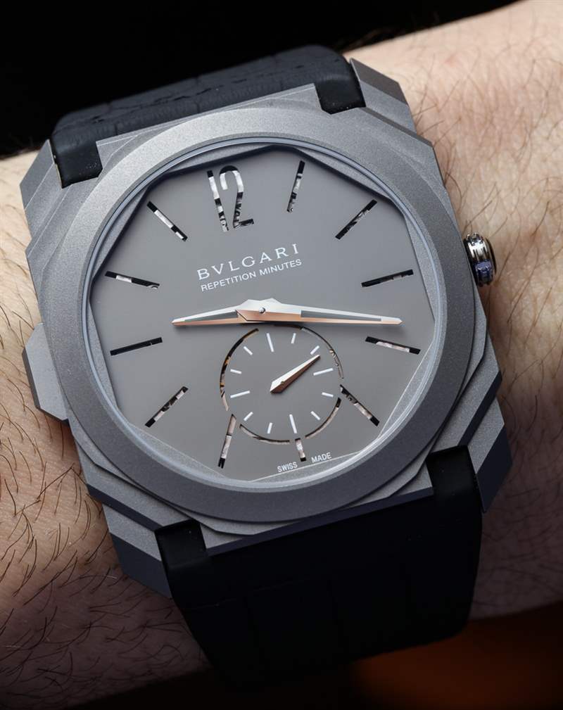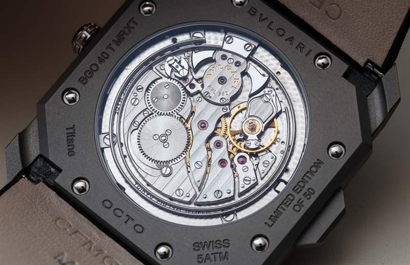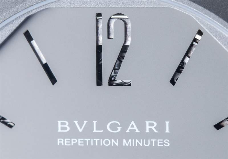 在噴砂鈦中,這種近乎工業(yè)的表面處理并不是大多數(shù)人對(duì)高端奢華手表的期望。話雖如此,鈦是用于三問報(bào)時(shí)表的最佳材料之一,因?yàn)樗奶匦圆粫?huì)減弱報(bào)時(shí)的聲音。黃金或鉑金等貴金屬是響亮的三問表的大敵,而當(dāng)您想要最響亮、最清晰的聲音時(shí),鋼和鈦是更好的選擇。寶格麗不僅將鈦用于表殼材料,還用于表盤。如果仔細(xì)觀察,您會(huì)注意到寶格麗 Octo Finissimo 三問報(bào)時(shí)腕表最有趣的設(shè)計(jì)細(xì)節(jié)之一:鏤空時(shí)標(biāo)和小秒盤。這不僅僅是為了風(fēng)格,而是作為幫助聲音傳播的一部分,從而充分利用內(nèi)部空間讓鈴聲產(chǎn)生共鳴。