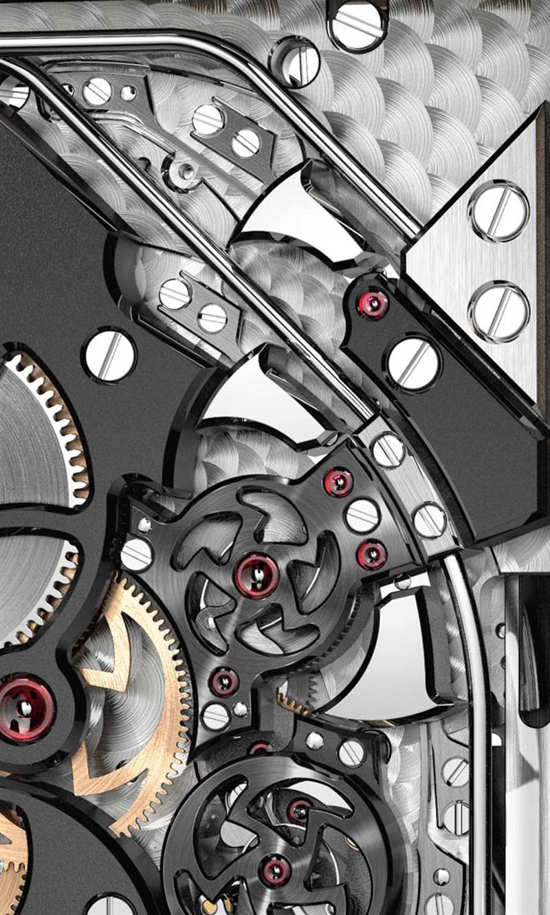 手表內(nèi)部是 MHC 口徑 3200AR 手動(dòng)上鏈機(jī)械機(jī)芯,由 450 個(gè)零件組成。許多機(jī)芯零件都鍍有黑釕,看起來(lái)很酷。據(jù)說(shuō)運(yùn)轉(zhuǎn)的火車(chē)齒輪也是由 18k 金制成的。該機(jī)芯以 3 赫茲(21,600 次/小時(shí))的頻率運(yùn)行,并具有 64 小時(shí)的動(dòng)力儲(chǔ)存。陀飛輪框架本身相當(dāng)大,寬 13.6 毫米。除了金和鈦,手表中使用的其他材料主要是鋼和“淬火鎢”(不太清楚那是什么)。