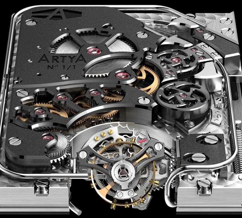 旋轉(zhuǎn)陀飛輪本身兼作小秒針指示器,而 ArtyA 三問(wèn)報(bào)時(shí)器、調(diào)節(jié)器和雙軸陀飛輪腕表的表面也有獨(dú)立的時(shí)針和分針表盤(pán)——將傳統(tǒng)表盤(pán)與機(jī)芯的鏤空顯示融為一體。它的外觀(guān)“非常ArtyA ”——有點(diǎn)像傳統(tǒng)鐘表學(xué)和搖滾樂(lè)的結(jié)合。