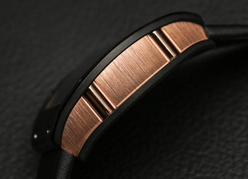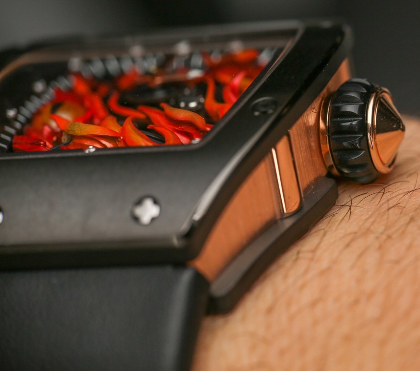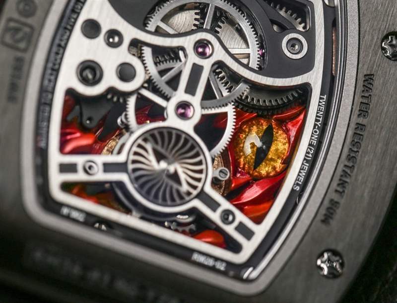 RM 26-02 表殼由 18k 紅金和黑色陶瓷制成。Richard Mille 使用經過精細拋光和倒角邊緣的高級陶瓷。材料的組合效果很好,因為它們彼此形成鮮明對比,并與邪惡之眼表盤的黑暗和熾熱主題相得益彰。表殼寬約 40 毫米,高約 48 毫米,厚 13 毫米。這本身并不小,但在較小的現代 Richard Mille 手表中,盡管彎曲的酒桶式表殼非常舒適地包裹在手腕上。