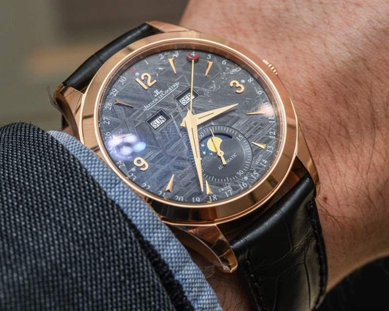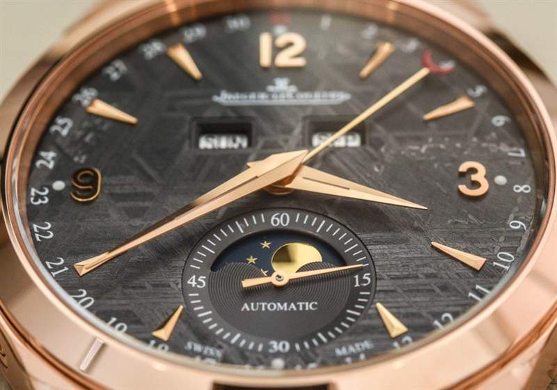 當然,積家也推出了無隕石表盤的精鋼或18k玫瑰金萬年歷腕表,搭配鍍銀表盤。那些看起來不錯,但隕石增加了視覺趣味,使時計更加獨特,在我看來,引人注目。一個合理的問題是“隕石表盤的溢價是多少?” 任一版本的答案都是 2,300 美元。因此,從標準的鍍銀表盤 Master Calendar 到 Jaeger-LeCoultre Master Calendar Meteorite 的成本要高得多。合理的價格?它并不便宜,但我想在隕石上打印更復雜,就像應用指示器和切割它一樣。最重要的是,隕石是一種稀有礦物,因此它的價格當然會高于標準金屬表盤。