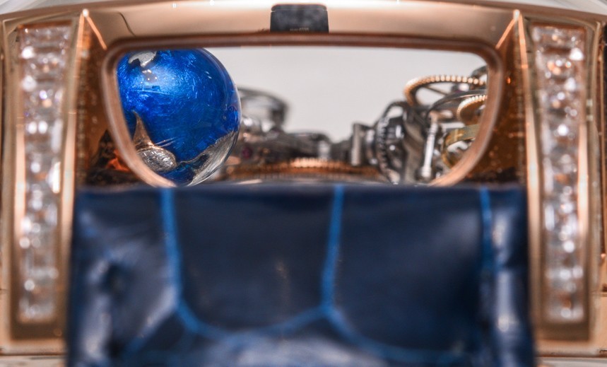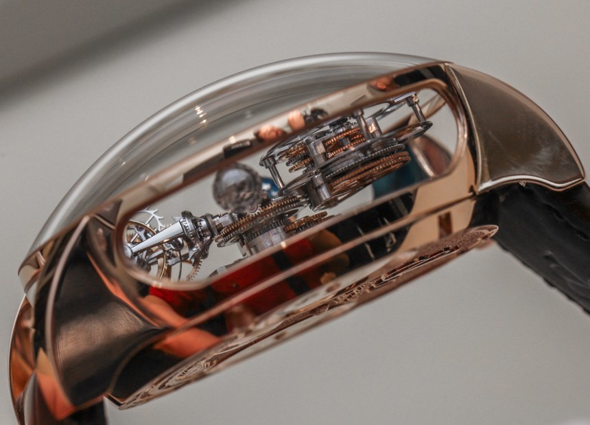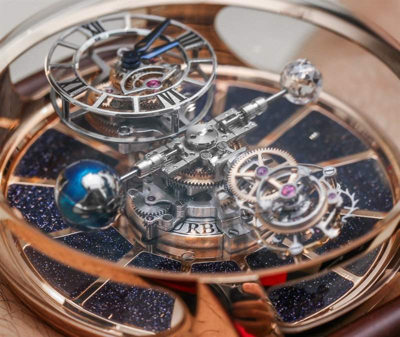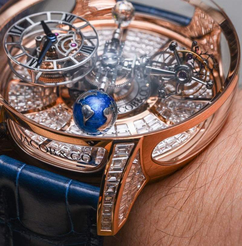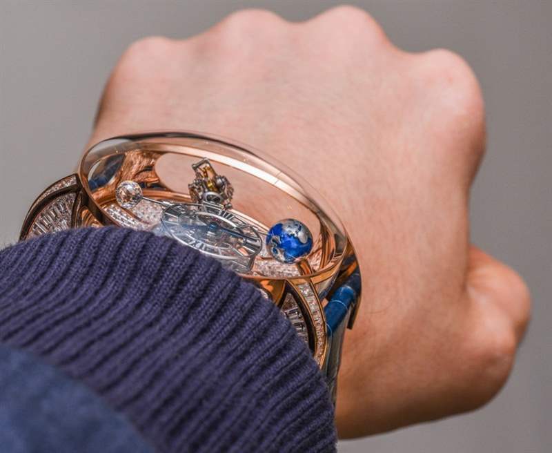 陀飛輪系統本身還有另外兩個軸點,每 60 秒旋轉一圈,然后每 5 分鐘轉向不同的方向。陀飛輪對面是一個時間表盤,它非常酷,因為無論它圍繞表盤旋轉到哪里,它都指向直立。我就是喜歡那個。然后是帶有微型手繪鈦球體的手臂,在它的對面是一顆“Jacob 切割”鉆石,該鉆石采用 Jacob & Co. 獨有的注冊工藝,使鉆石具有球形表殼和 288 個刻面。地球儀和鉆石迪斯科球每 60 秒旋轉一圈。