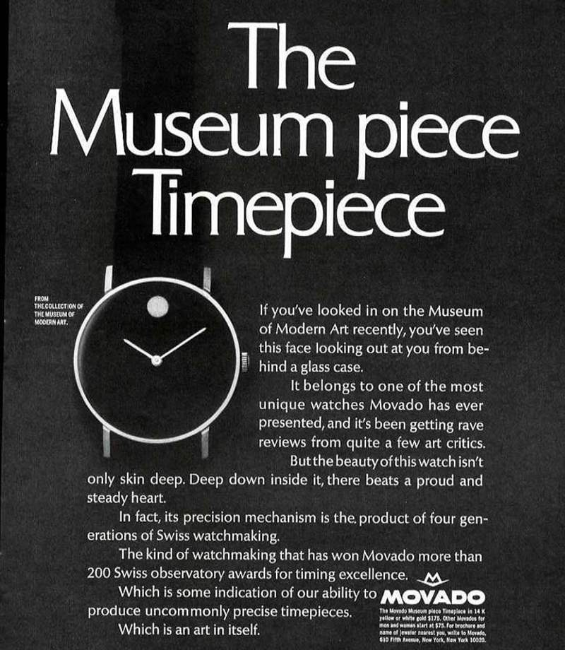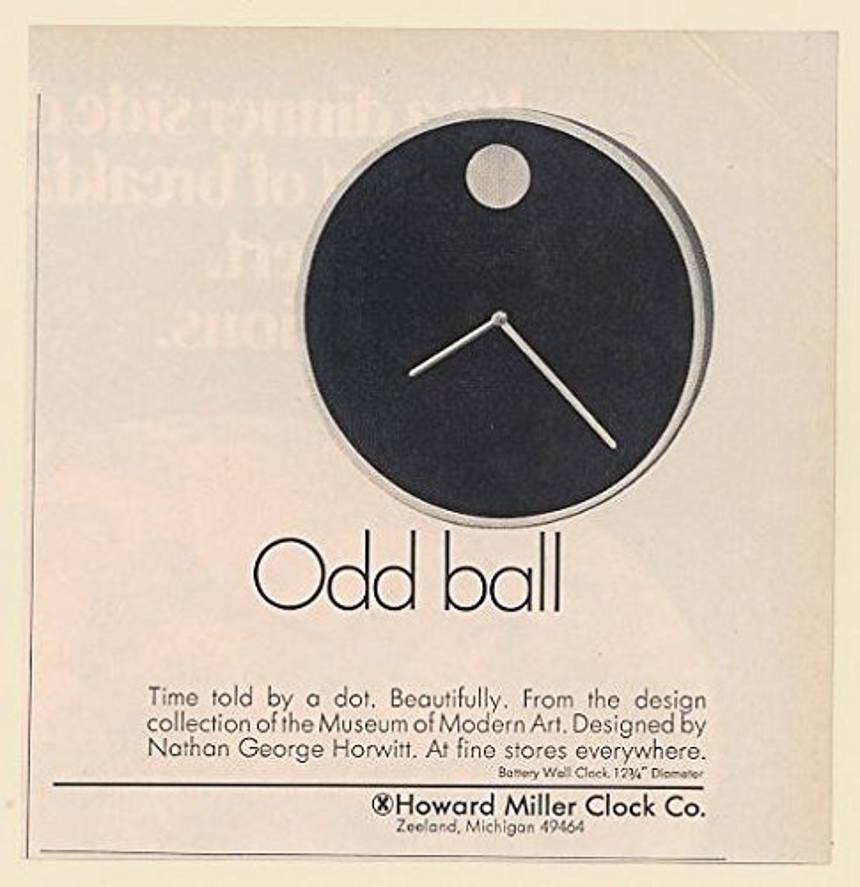 在 1960 年代,博物館表盤作為掛鐘和臺鐘變得非常流行。生產(chǎn)由受歡迎的家具制造商 Herman Miller 完成。我不完全確定導(dǎo)致 Herman Miller 銷售和分銷時鐘的業(yè)務(wù)安排。在上面的廣告中,您可以看到 Herman Miller 時鐘表明了一些有趣的事情。首先,在當(dāng)時,鐘表的設(shè)計(jì)被認(rèn)為很奇怪——但又非常漂亮。從“奇怪的球”聲明中可以清楚地看出這一點(diǎn)。其次,Herman Miller 在他們的廣告中承認(rèn) Nathan George Horwitt 以及 MoMA 的“設(shè)計(jì)收藏”。我認(rèn)為這個問題很突出,因?yàn)樵?1960 年代的同一時間,記錄似乎表明摩凡陀繼續(xù)生產(chǎn)博物館表盤的腕表版本。