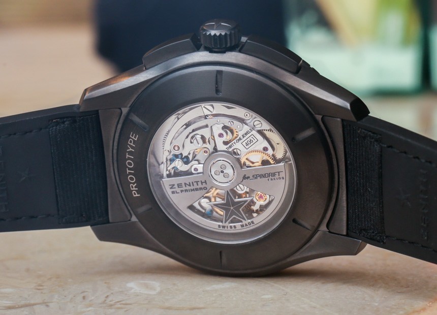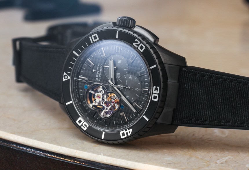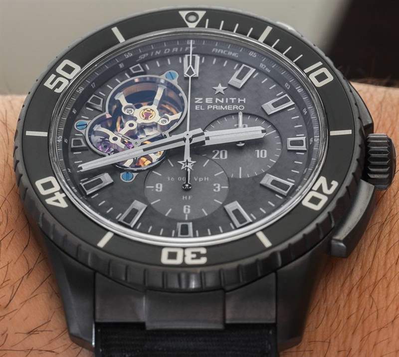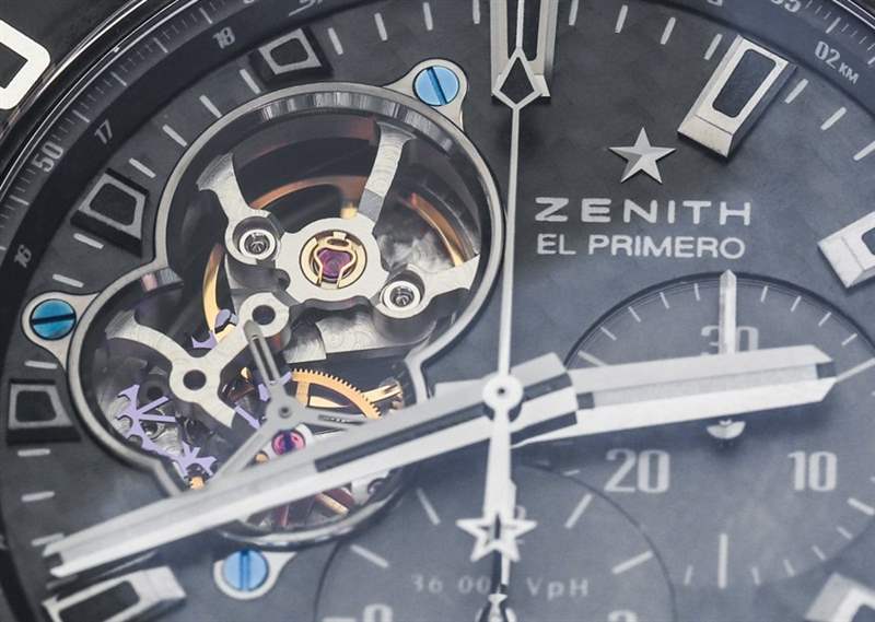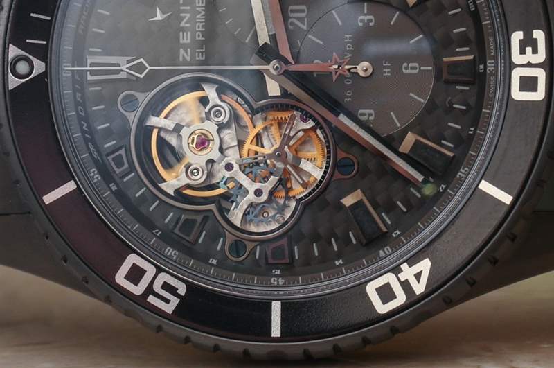 對(duì)于全黑手表,這款手表的易讀性非常好,因?yàn)楸肀P上有各種深淺不一的黑色和灰色,以及不同的紋理和飾面。這意味著真力時(shí)能夠在沒有難以讀取的時(shí)計(jì)的情況下實(shí)現(xiàn)幻影外觀。當(dāng)然,表盤的開放部分有一些顏色,您可以在那里看到內(nèi)部制造的 Zenith El Primero 機(jī)芯的元素。