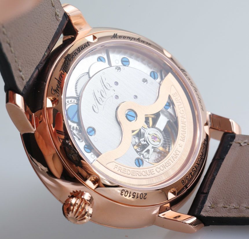 腕表內(nèi)部搭載康斯登自制和設(shè)計(jì)的 FC-705 自動(dòng)上鏈機(jī)芯。該機(jī)芯本質(zhì)上是 Frederique Constant 口徑 FC-710(在此處評(píng)論的 Classics Manufacture 手表內(nèi)),帶有月相但沒有中央秒針。該機(jī)芯以 4 赫茲(28,800 次/小時(shí))的頻率運(yùn)行,具有 42 小時(shí)的動(dòng)力儲(chǔ)存。事實(shí)上,該系列機(jī)芯可能是日內(nèi)瓦地區(qū)生產(chǎn)的最便宜的瑞士制造機(jī)芯。