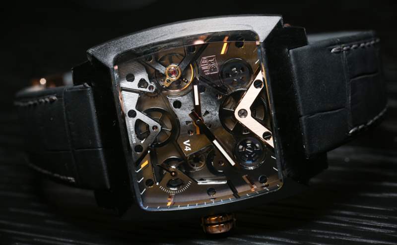 這件作品有一個(gè)不會(huì)變舊的表盤。令人驚嘆的設(shè)計(jì)證明了人們最初想要與 Ruchonnet 合作的原因。Monaco V4 將傳統(tǒng)機(jī)械元素與現(xiàn)代設(shè)計(jì)融為一體,是炫耀您作為手表迷身份的“酷”方式。從功能上講,它只顯示時(shí)間、小時(shí)和分鐘以及位于 4 點(diǎn)鐘位置的小秒盤。手表背面的事情變得越來越有趣。